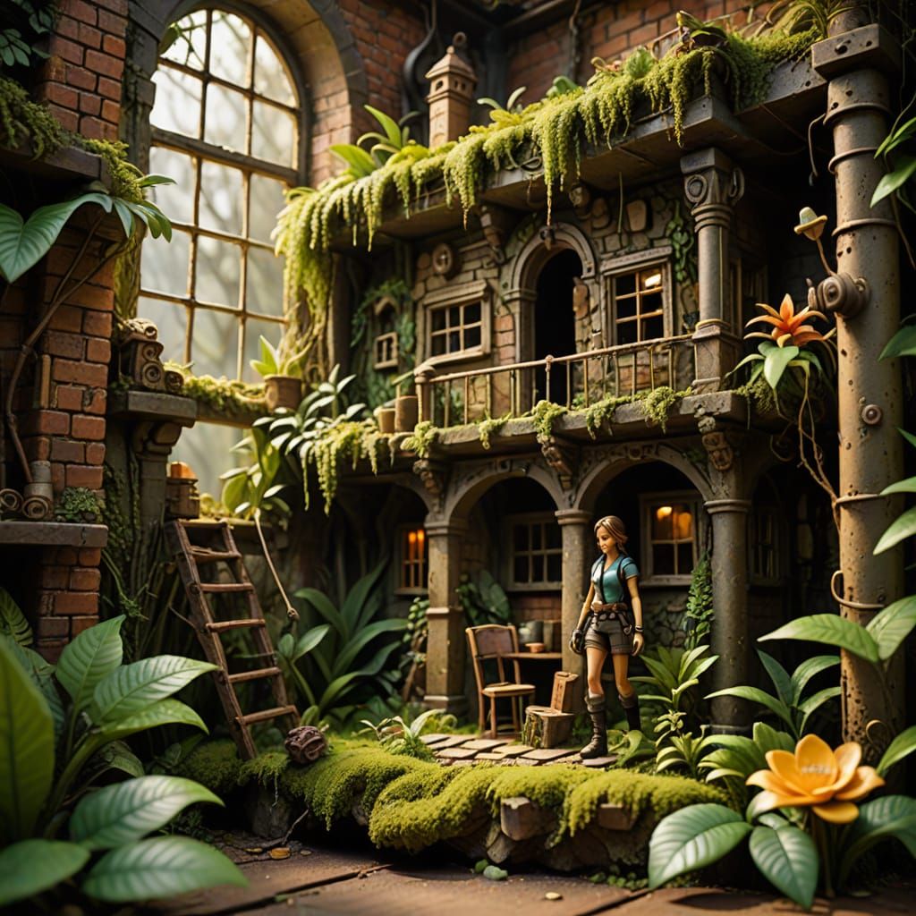This charming miniature sculpture captures a nostalgic scene of Lara Croft standing in a lush jungle, surrounded by colorful flowers and distressed textures, with a whimsical, storybook illustration style.