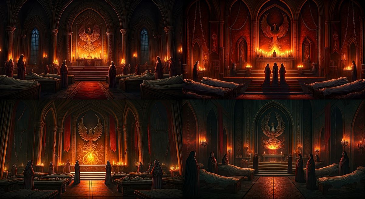 This image shows the interior of a temple with Eastern and Gothic elements. Wounded rest on beds, attended by priestesses in white and crimson robes, their hands glowing with light. A phoenix relief dominates the altar.