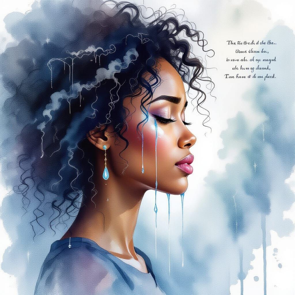This image shows a watercolor portrait of a Black woman with curly hair in profile, crying. Indigo and gray tears blend into the background, suggesting sorrow. The artwork is gentle and dreamlike.