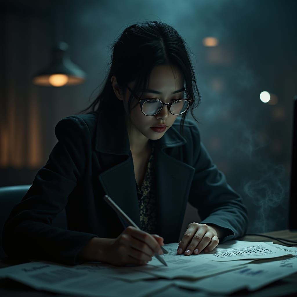 This image shows a woman detective with sharp features, inspired by Sherlock Holmes, surrounded by stock market charts in a dimly lit, smoke-filled room. She wears a dark trench coat with a subtle batik pattern and vintage glasses, blending film noir and Indonesian batik styles.