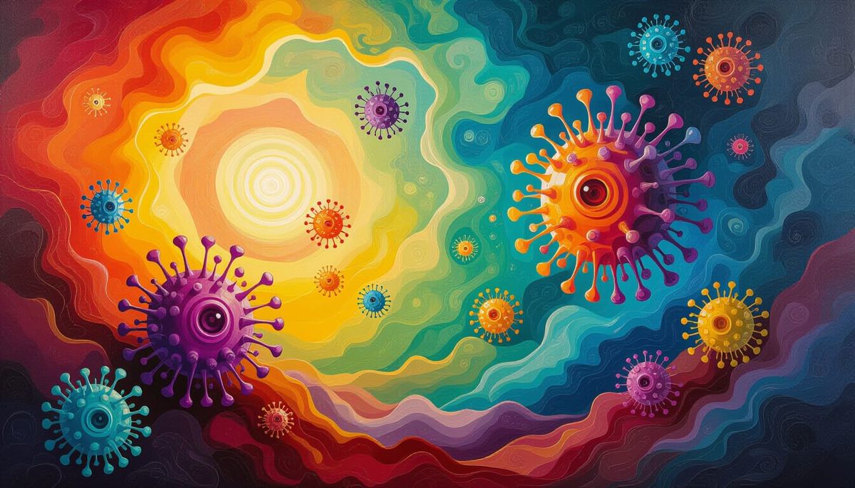 This image shows silly microbes in a psychedelic, abstract surrealism painting with thick oil and alcohol ink textures. High-contrast lighting highlights intricate details and intense colors in a dynamic composition.