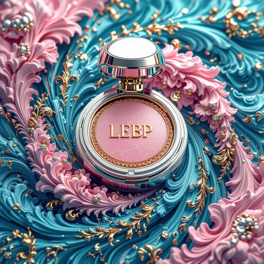 This image shows an acronym logo design in silver and gold tones, surrounded by swirling pink and turquoise blue colors. The design resembles intricate fantasy concept art with an 8k resolution.