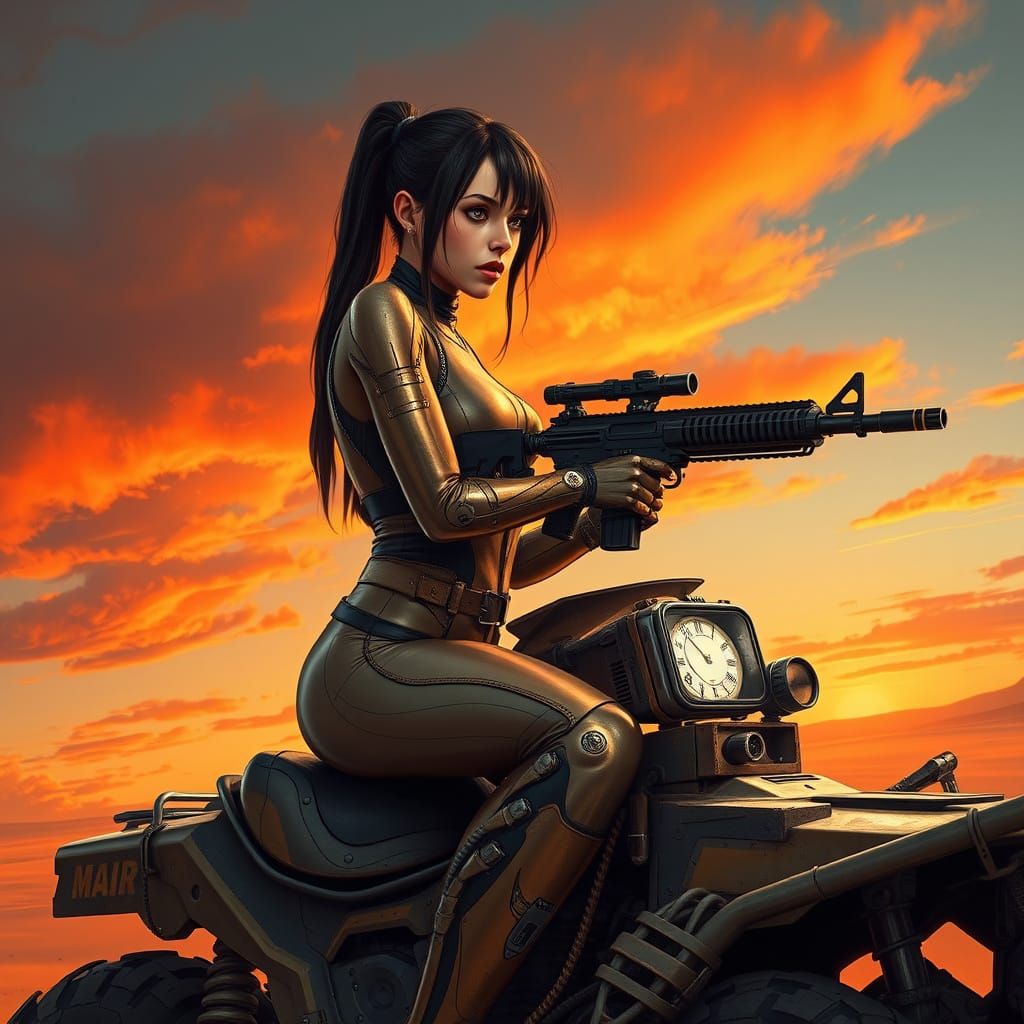 A striking image of a cyborg girl sitting on a rugged vehicle, with a machinegun mounted on top, set against a vibrant desert sky with intricate details and dramatic lighting, in a futuristic, hyperrealistic style.