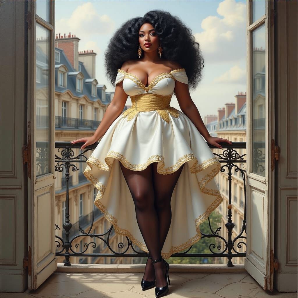 This oil painting shows a beautiful plus size black woman in a white and gold dress on an old Parisian hotel balcony. She wears black tights, heels, and gold earrings, with powdered white face.