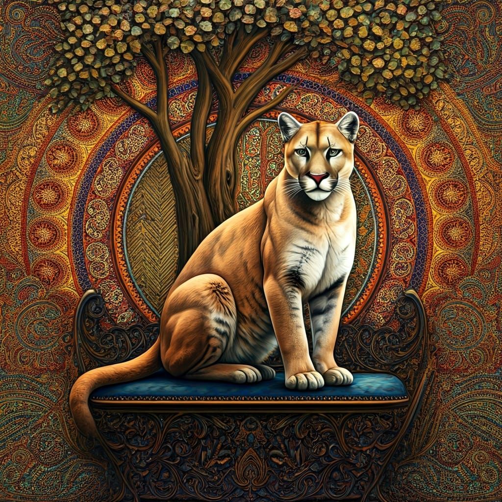 A striking picture of a cougar on a bench, beneath a whimsical tree. Intricate patterns fill the scene with textures and shimmering accents, rendered as an elegant, ornate painting.