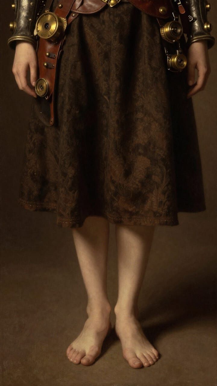 This image shows a full-body portrait of a woman in a vintage steampunk style, focusing on her bare feet. Rendered as a detailed oil painting with dramatic, sepia-toned lighting.