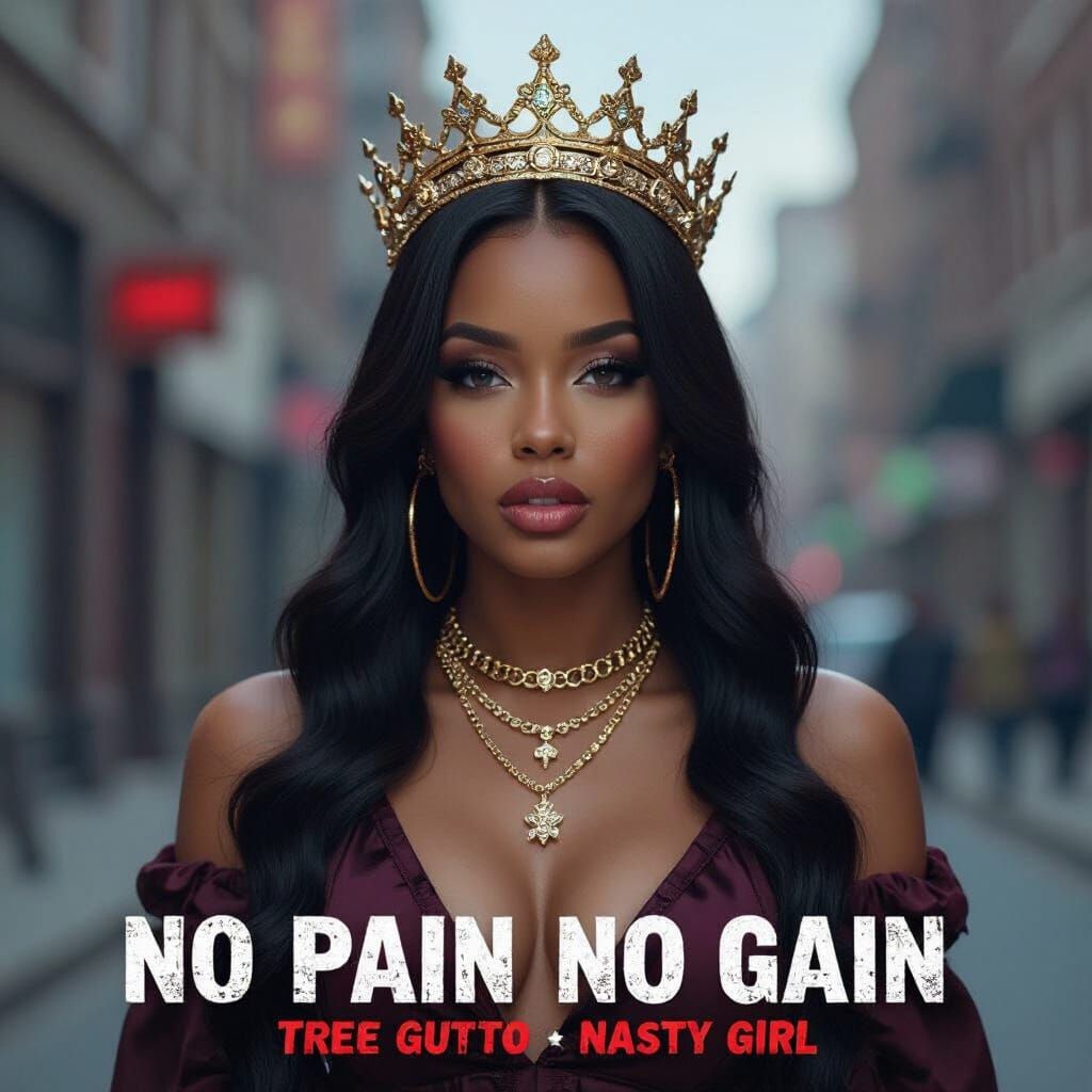 A striking image of a logo for the rapper Queen Miya and her album 'No Pain No Gain'. The design embodies a dark, ghetto aesthetic, capturing a 'nasty girl' vibe.