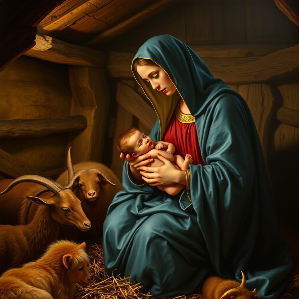 This serene Renaissance-style painting depicts the Virgin Mary cradling her newborn baby Jesus in a rustic manger, surrounded by gentle animals in a warm, golden-lit stable, with intricate textures and soft, ethereal light.