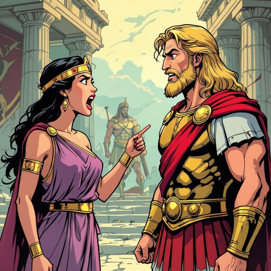 This image depicts two ancient Greek rulers in a vibrant, exaggerated cartoon style. The queen confronts the king, pointing dramatically at a young man in the background. Features bold outlines and saturated colors.
