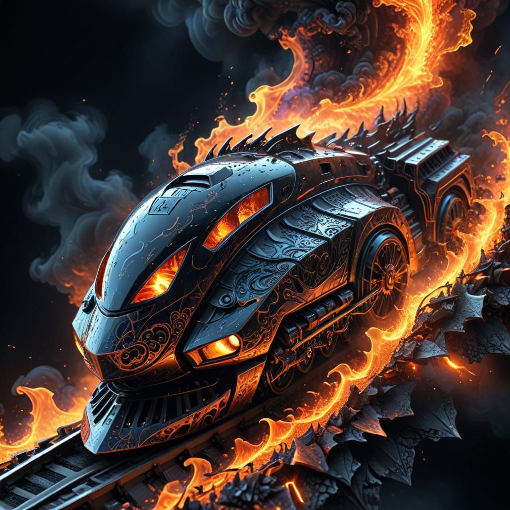 This vibrant, high-contrast image showcases a train with obsidian armor speeding towards a fiery abyss, set against a backdrop of fractal patterns and metallic textures, with 3D shading and Zentangle-inspired details