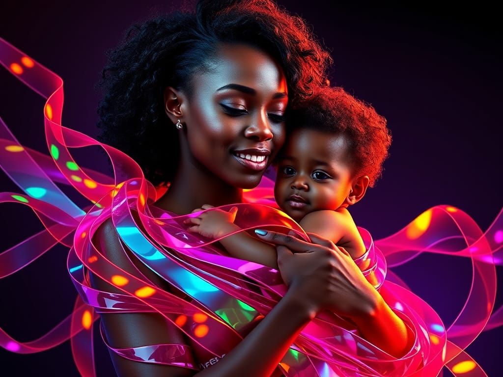 This image shows a mother and child embraced in flowing ribbons of light. Holographic displays and accent lighting add a hyperrealistic quality to the digital art.