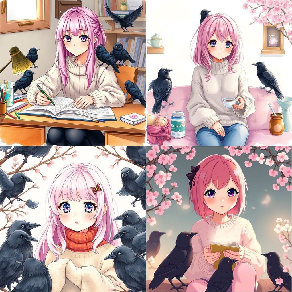 This image shows a charming girl surrounded by cute crows and a coloring book, exuding a sense of relaxation and calm. The scene is depicted in a stylized anime aesthetic.