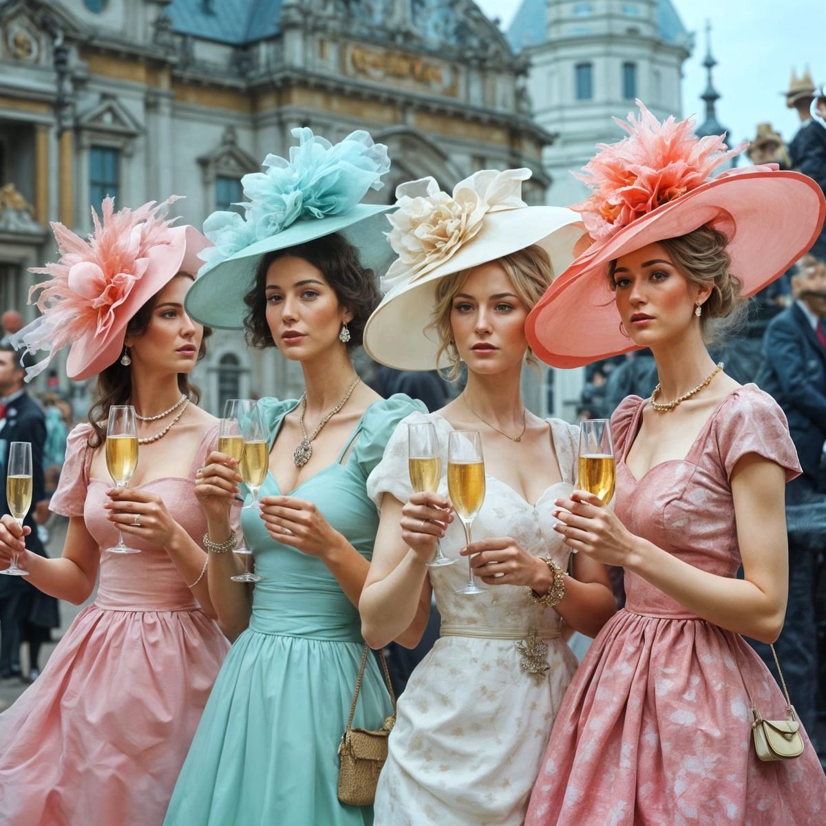 <lora:Classical study:1.0> Race day at Royal Ascot, Ladies day, 4 women wearing designer dresses and large hats sipping champagne.