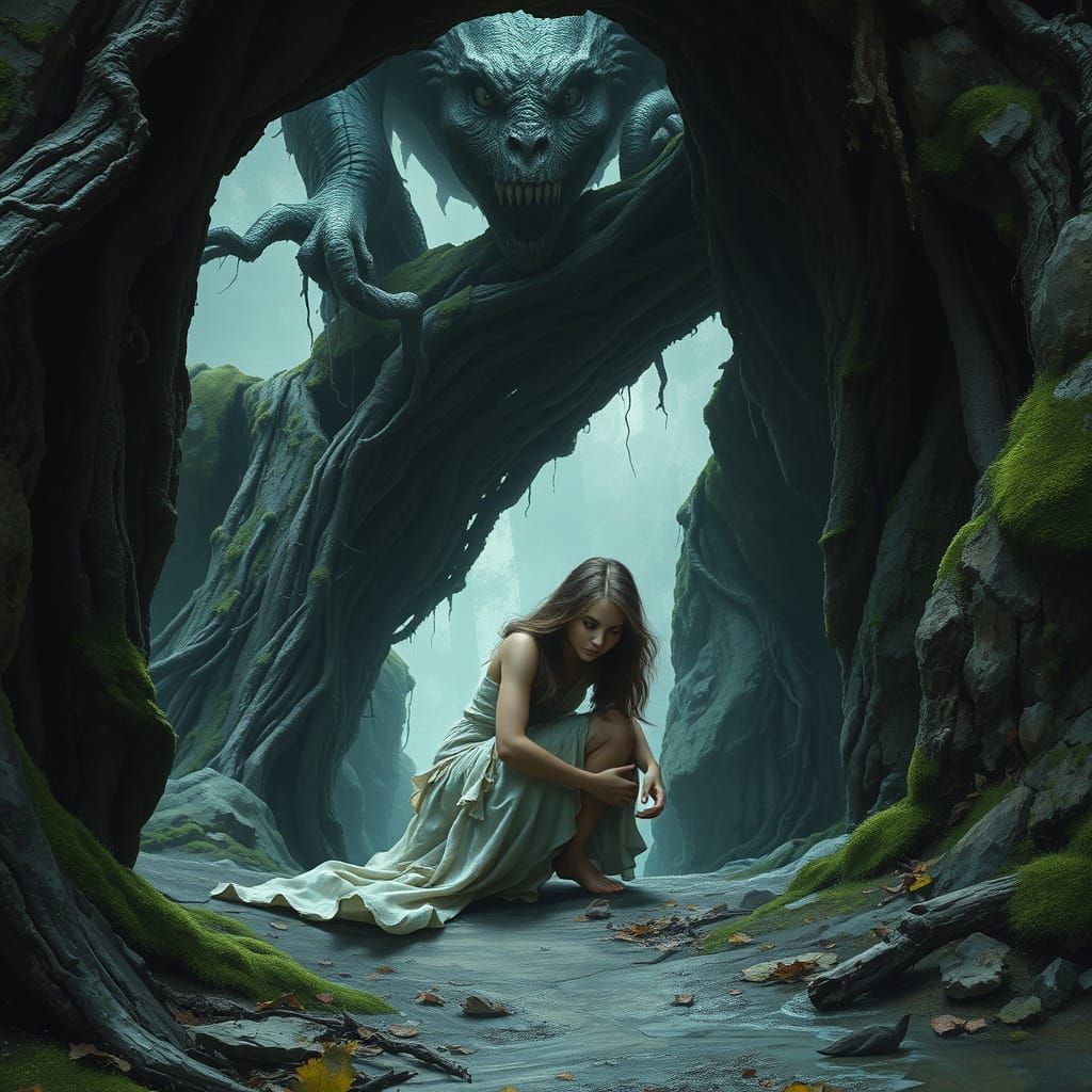 A haunting digital painting of a young woman cowering beneath a moss-covered bridge, stalked by a menacing creature in a dramatic, atmospheric scene reminiscent of cyberpunk and fantasy art