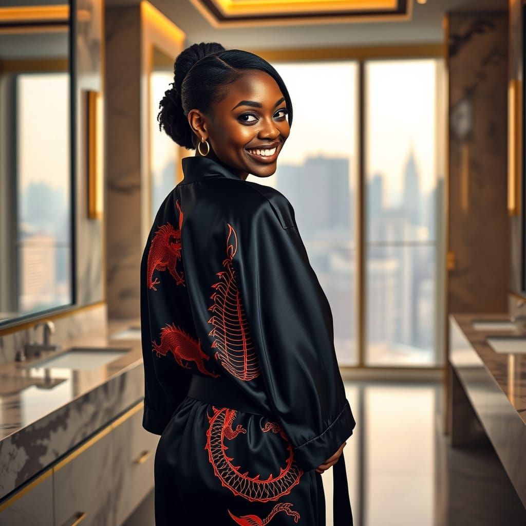 This image shows a stunning photorealistic portrait of a dark-skinned woman posing in a luxurious bathroom setting, surrounded by marble and soft golden light, with a vibrant Chinese dragon embroidered on her black silk bathrobe.