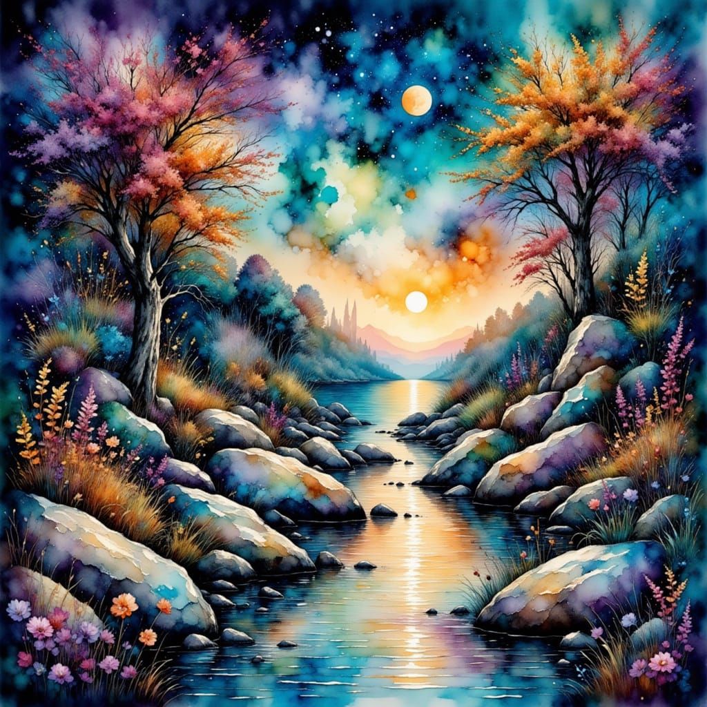 A vibrant watercolor painting of a space station suspended in a nebula. Crystalline walkways dissolve into colorful halos, with gold highlights and alcohol ink textures in ultramarine hues.