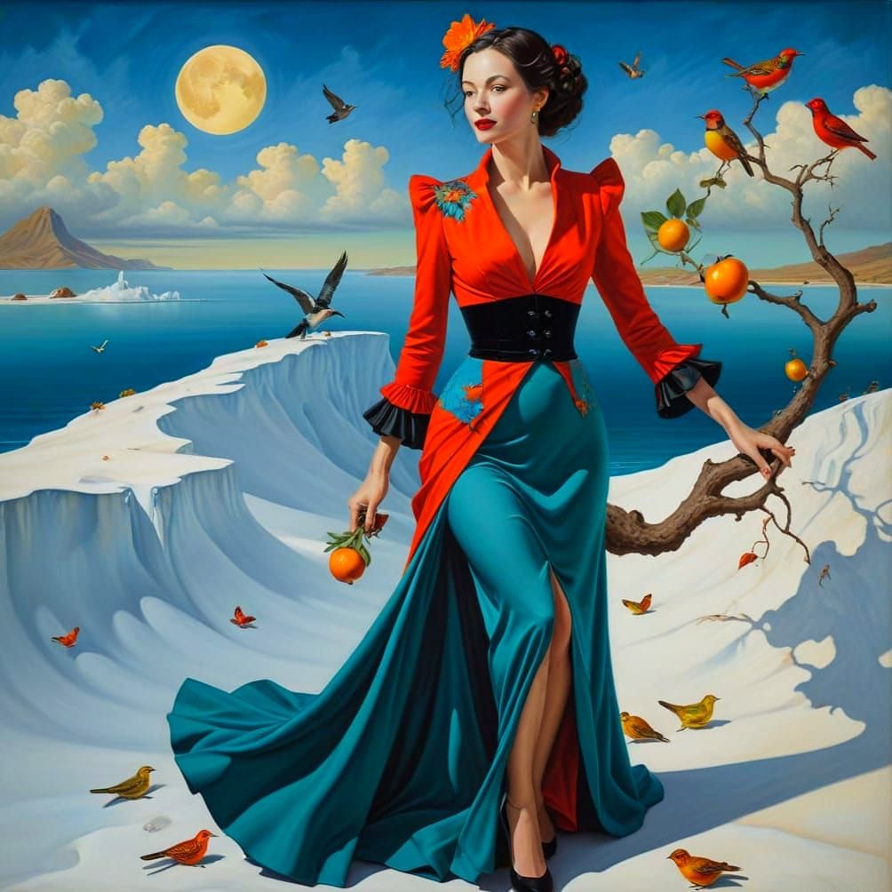highly expressive photorealistic beautiful happy smiling 48-year-old lady in fantastic surrealistic scene, photographically rendered charming face, amiable engaging expression, graceful dynamic posture, elegant flamboyant extravagant outfit, bright natural lighting, enhanced natural colors, stunning ...