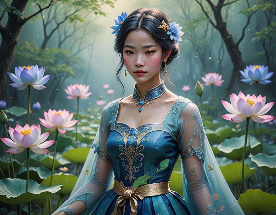 This image shows a shapeshifting female creature embodying a bluebell flower. She stands as a guardian amidst lotus blossoms in a dreamy, soft-focus composition with a watercolor style.