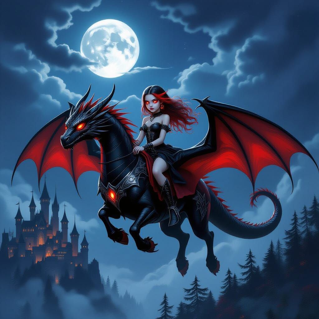 A vampire girl with red eyes rides a black and silver dragon through a cloudy night sky, with a gothic castle in the distance. Dark fantasy illustration with dramatic lighting.