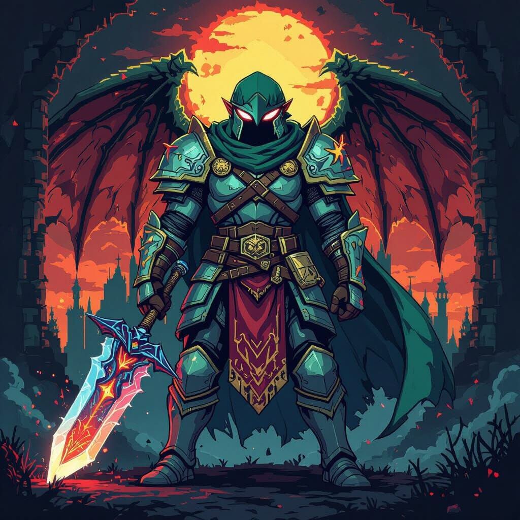 This image depicts a heroic armored figure holding a crucible and the Hell Sword, rendered in a vibrant, retro pixel art style with square pixel textures.