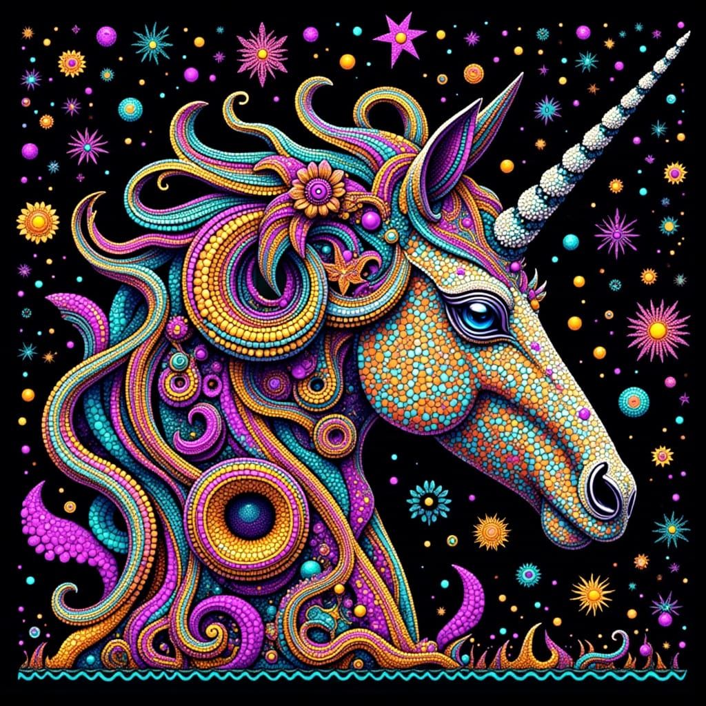 This digital art piece features an intricately detailed unicorn horn. It combines Escher-like impossible structures with Kusama's iconic polka dots in a vibrant, surrealist style.