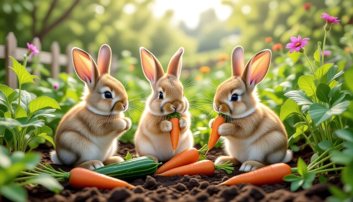 This 3D digital art depicts adorable, whimsical bunnies enjoying fresh vegetables in a beautifully painted backyard garden setting.