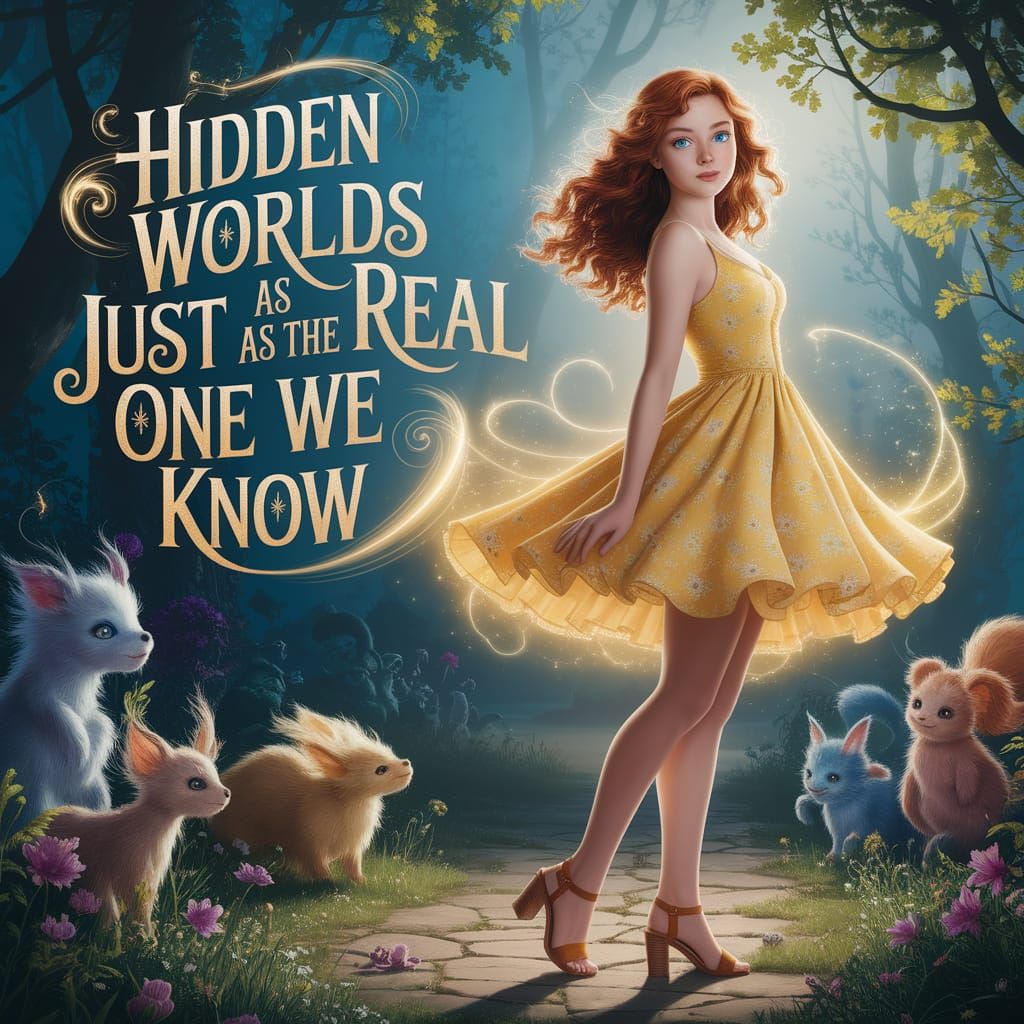 This captivating image shows a young woman in a flowery sundress, surrounded by magical creatures in an enchanted forest, with a glowing aura and a sense of wonder and enchantment.