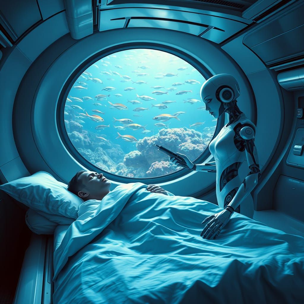 This image shows a futuristic submarine's sleeping quarters, where a female droid cares for a sick sailor. The scene is set amidst a vibrant coral reef, teeming with marine life, and features a blend of industrial and biomechanical design elements.