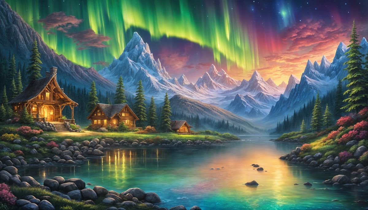 A serene painting of a cozy cabin in a mountain valley, surrounded by pine trees, waterfalls, and towering peaks, with the vibrant colors of the Aurora Borealis dancing above.