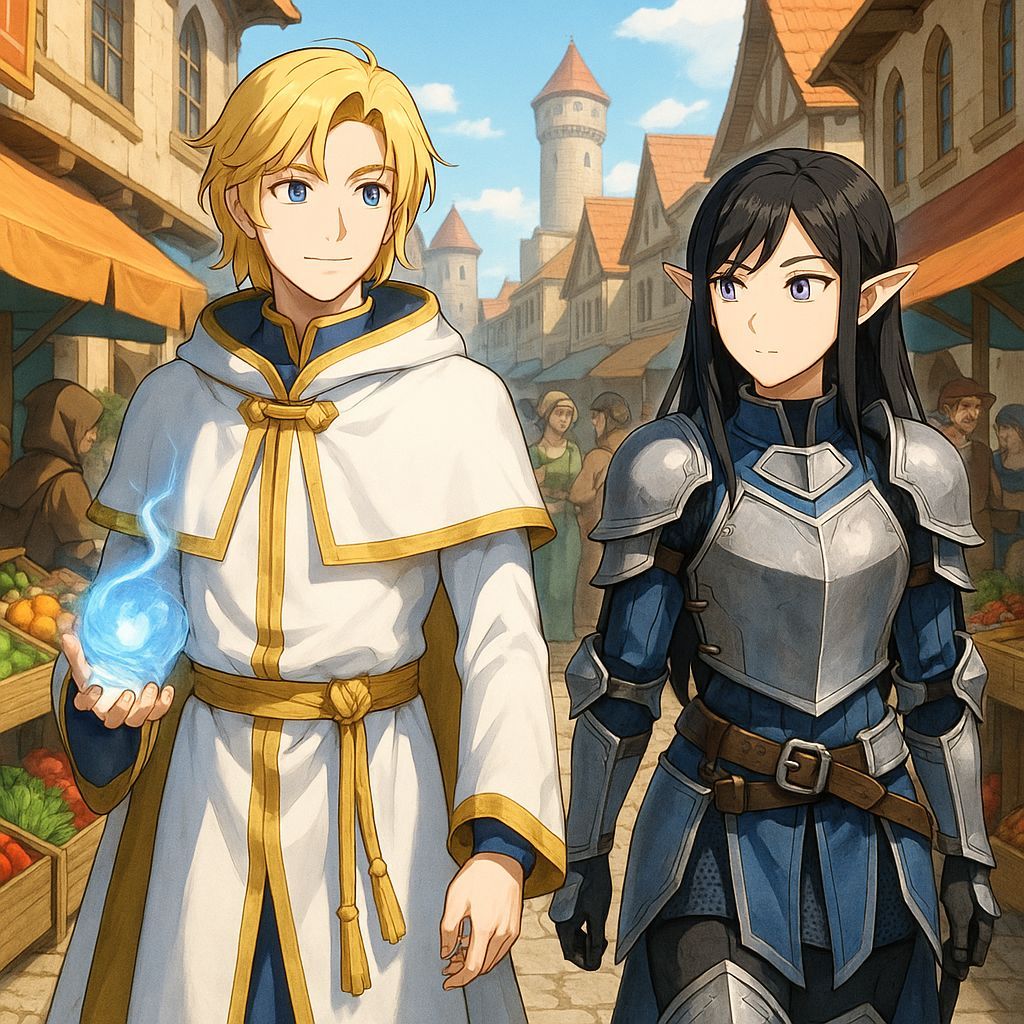 A fantasy city scene at noon, featuring a blonde sorcerer and a black-haired elven warrior amidst vendors and shoppers, set in a medieval-inspired world with anime-style visuals.
