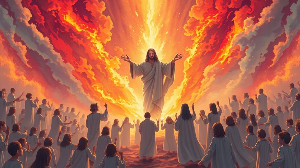 This image depicts a fantastical purgatory scene, with Jesus surrounded by souls in flowing white robes, set amidst a fiery, dreamlike atmosphere, evoking a sense of wonder and spirituality, with intricate textures and subtle shading reminiscent of Studio Ghibli's and Makoto Shinkai's signature styles.
