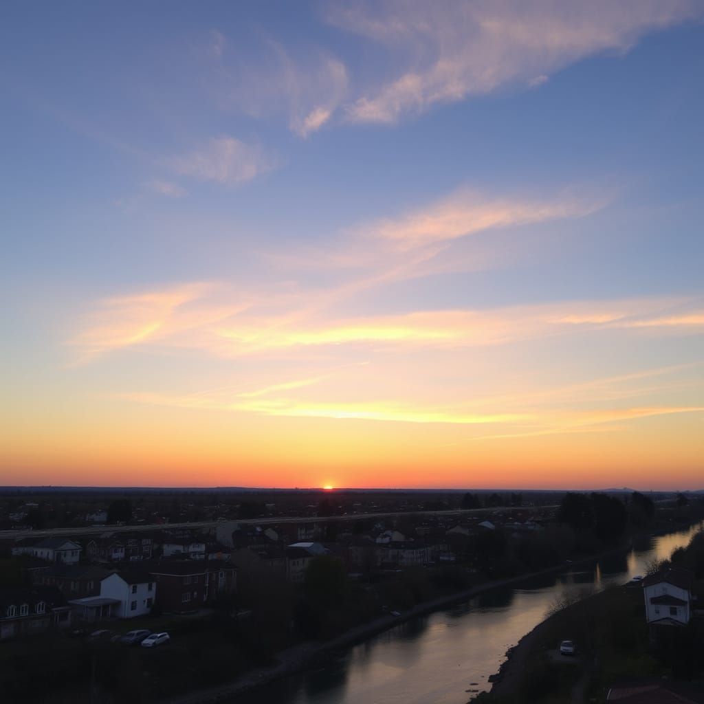 This image shows a sunset over a small town, featuring a river. The sunset sky includes surreal elements with many doors, creating a dreamy atmosphere.