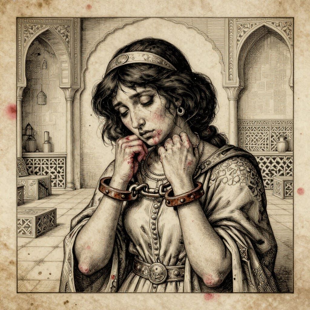 This image shows a detailed ink drawing of a political prisoner resembling a princess, blending medieval anatomy with Persian court aesthetics. Rendered in sepia tones with hints of vermilion, it evokes a grimdark mood.