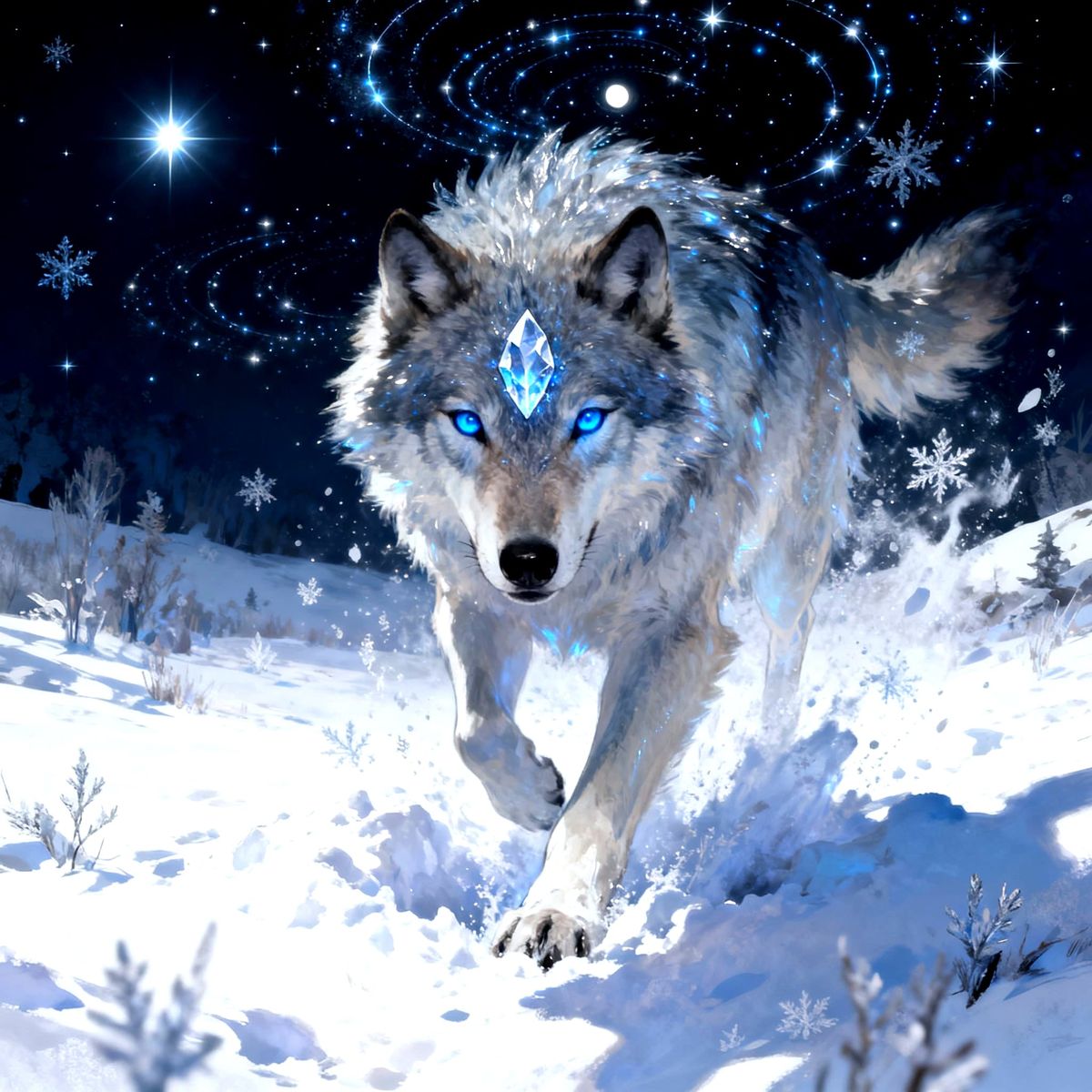 A mystic wolf with glowing eyes and ice crystals on its forehead bursts from a snowbank. The dark, moonlit sky features astral patterns and bright stars, rendered in a fantasy illustration style.