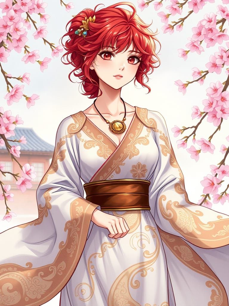 This image features a beautiful young woman with vibrant red hair and a stunning gold pendant, dressed in a flowing white and brown gown with intricate designs, surrounded by cherry blossoms in a serene Japanese setting, with delicate watercolor textures and bold lines reminiscent of anime and manga art.