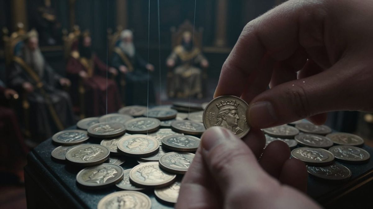 A cinematic close-up of fingers releasing coins with crowned faces and religious symbols in a hyper-detailed dystopian concept art scene. Features shallow depth of field and a dark, muted palette.