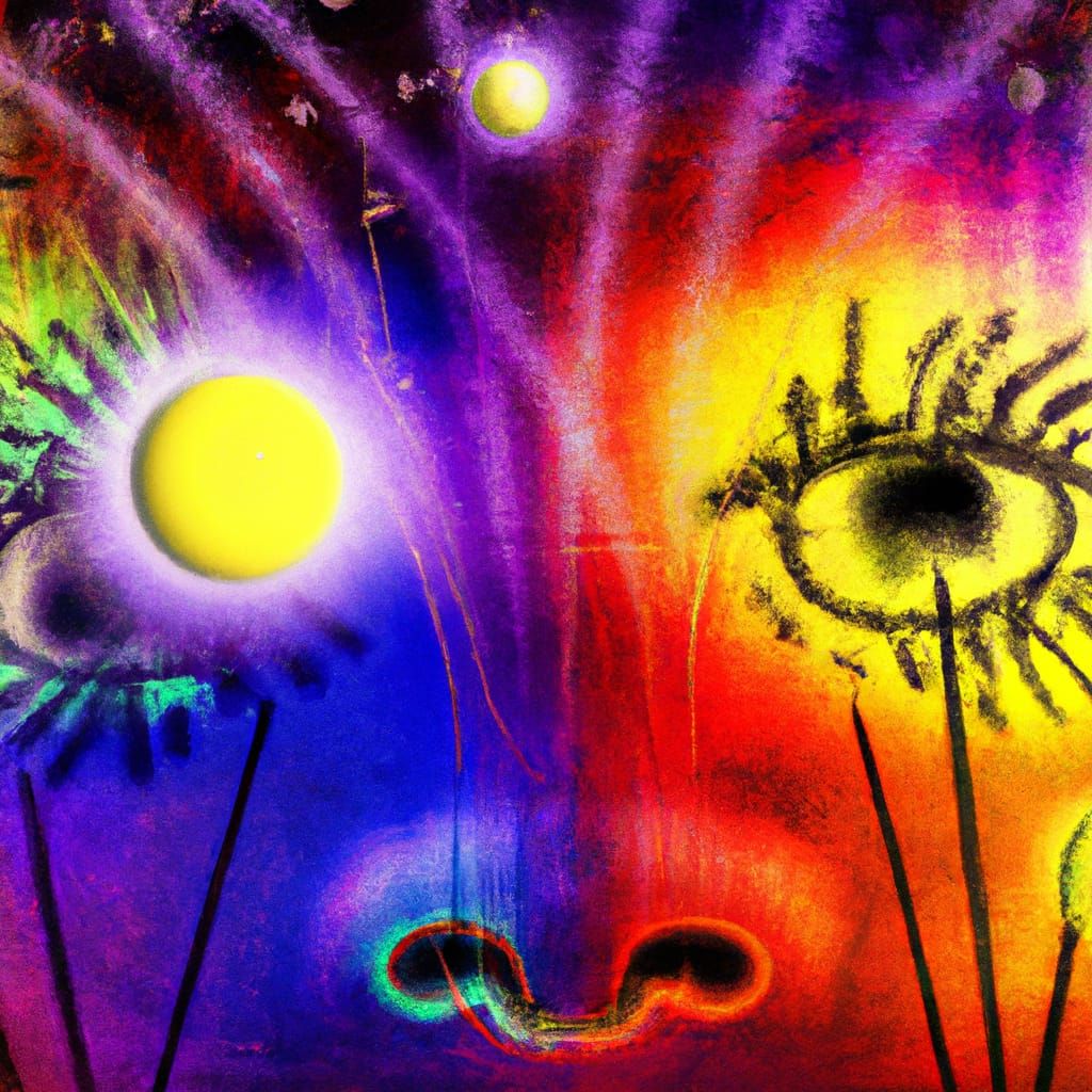 This image shows an array of colorful humanoid figures. The image features iridescent light and a focus on large eyes, creating an otherworldly and strange atmosphere.
