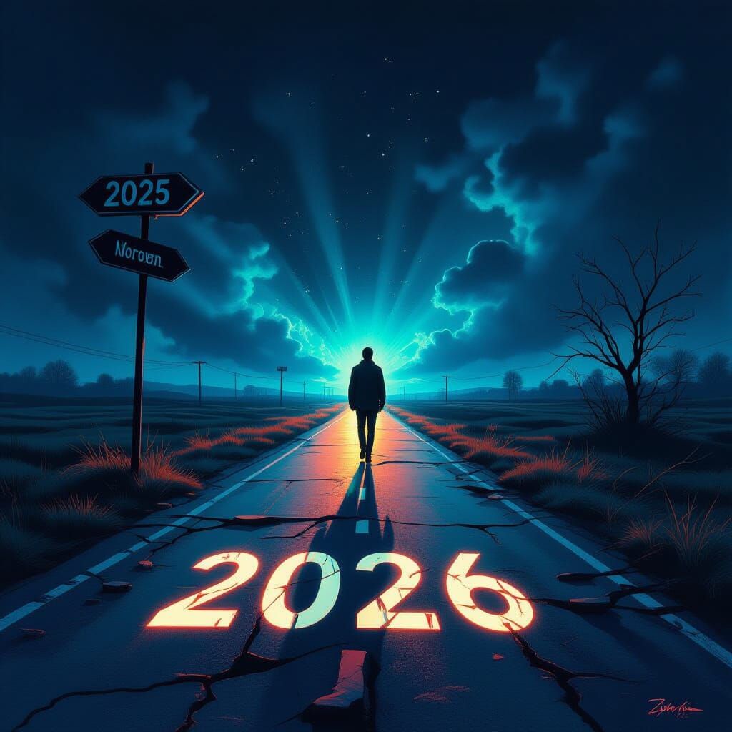 This image shows a transition from a dark, broken road labeled 2025 to a luminous, hopeful path for 2026, rendered in a surrealist digital painting style with vivid colors.