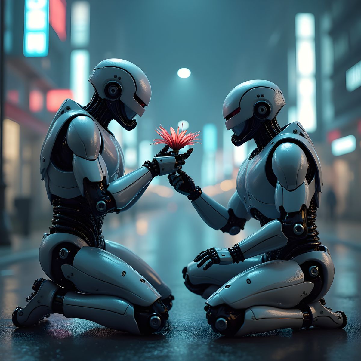 This image shows a poignant and futuristic proposal scene between two androids, set against a softly blurred urban nightscape with cool blue and silver tones, featuring hyper-realistic rendering and meticulous surface textures.