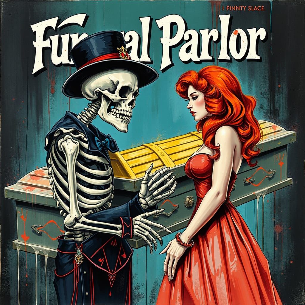 This image shows a vintage magazine cover featuring a skeleton casket salesman presenting a casket to a redhead woman, rendered as colorful graffiti art.