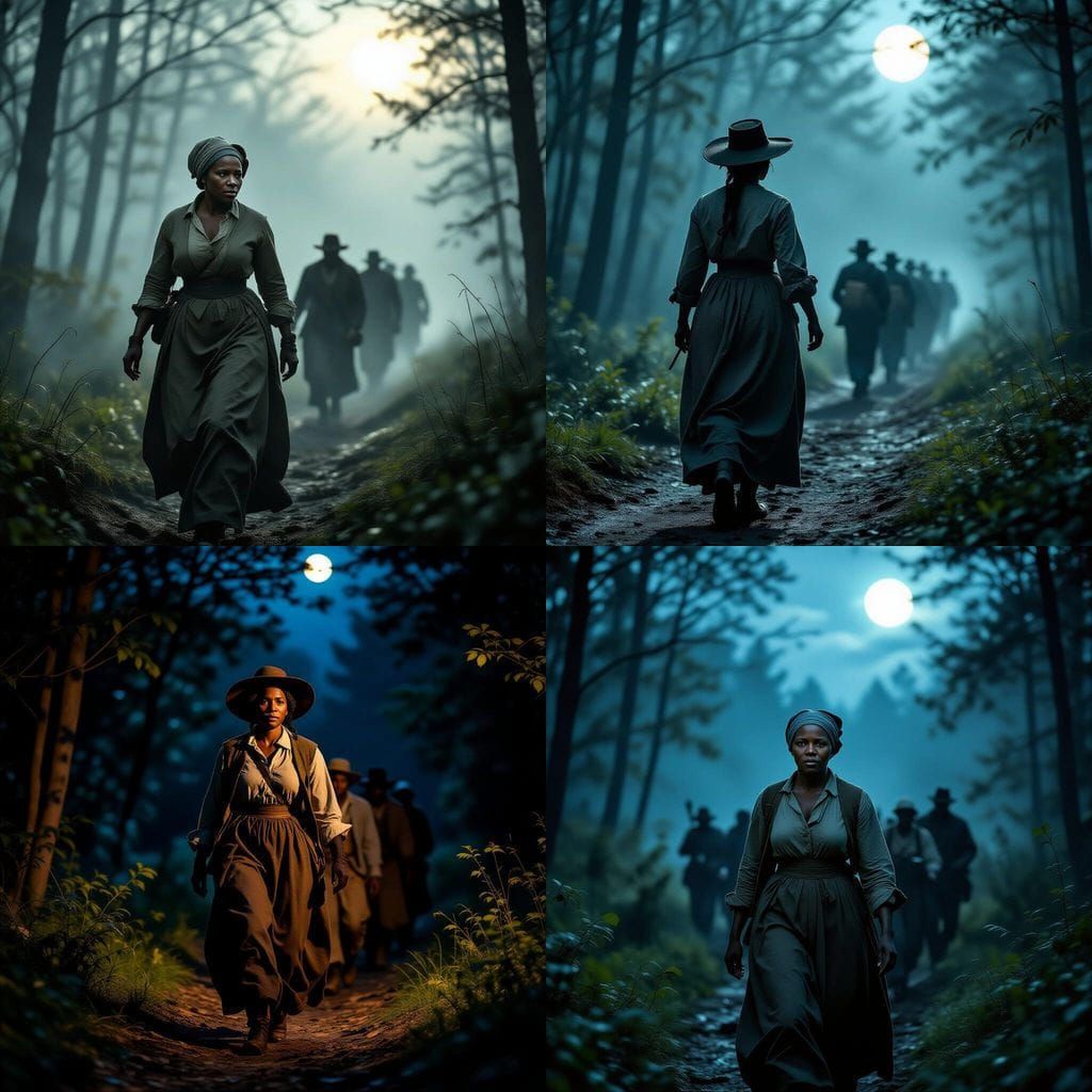 This image shows a postage stamp depicting Harriet Tubman leading enslaved people to freedom during the Civil War. The scene is rendered with cinematic lighting and film grain, creating a dramatic and atmospheric effect.