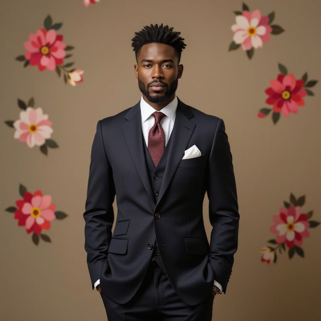 A striking portrait of a man in a tailored suit, captured in a studio setting. The artwork features dramatic lighting and a vibrant color palette, in a contemporary pop art style.