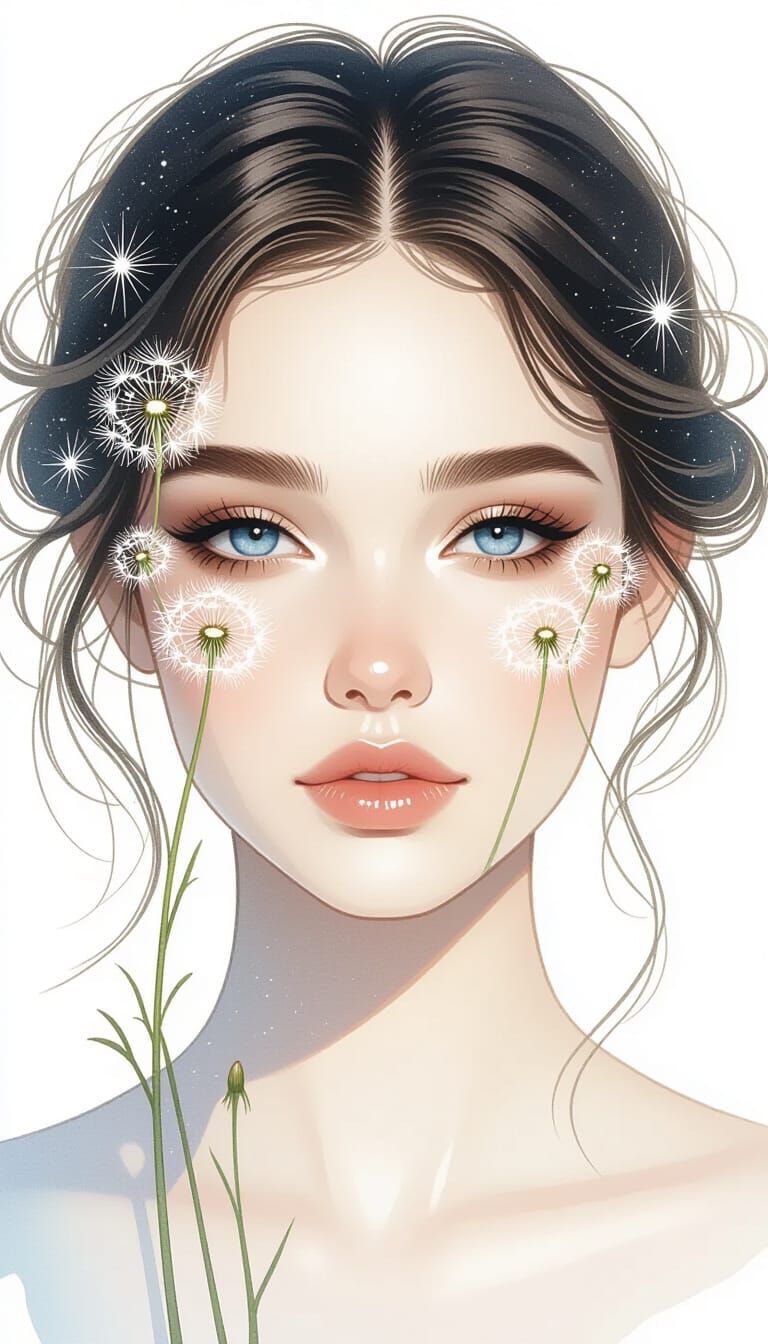 A surreal portrait of a woman with nebulae reflected in her eyes and dandelions on her face. The image features smooth gradients blending celestial and earthly elements in a dreamy watercolor art style.
