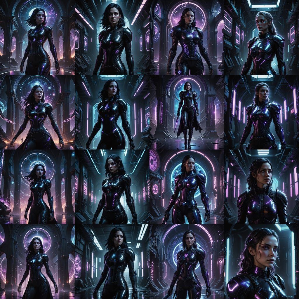 A striking image of a beautiful woman with violet eyes and silver-black hair in a sci-fi villain lair. She wears obsidian armor with glowing circuitry and holds a runic sword. The background features gothic arches and a fractured moon.
