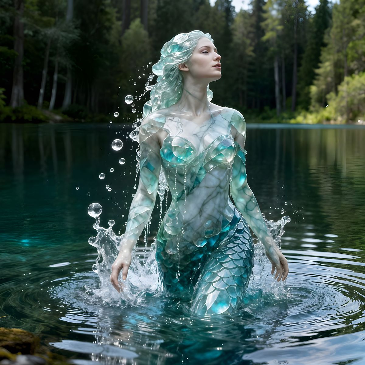 A highly realistic fantasy image of a translucent, pearlescent feminine figure emerging from a forest lake, with water and droplets frozen mid-air. Cinematic lighting enhances the elemental aesthetic.