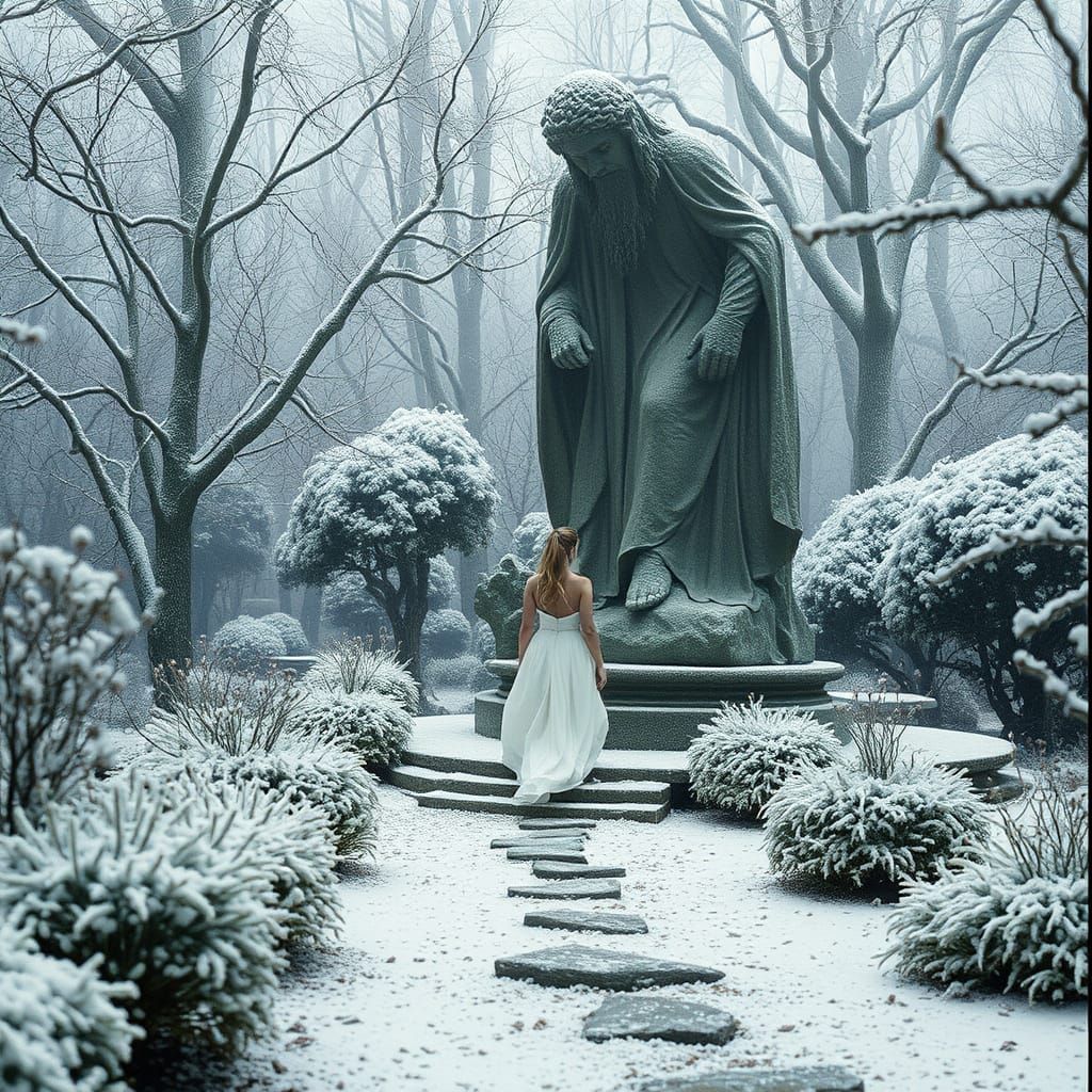 A cinematic image of a misty, shadowy garden featuring a moss-covered marble statue and a woman in white. The scene is presented with film grain and atmospheric lighting.