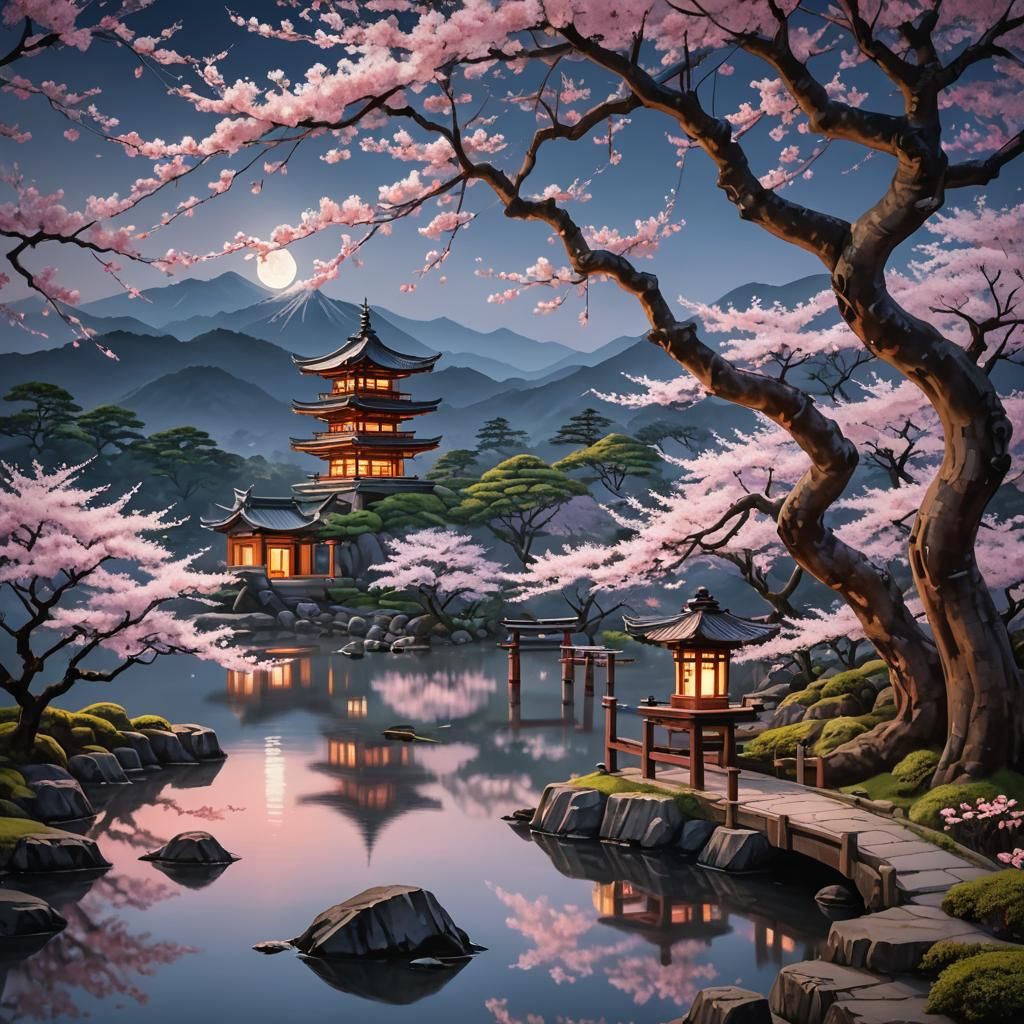 A serene scene featuring a cherry blossom tree illuminated by moonlight, with pink petals and traditional Japanese elements. The artwork is reminiscent of concept art with cinematic lighting.