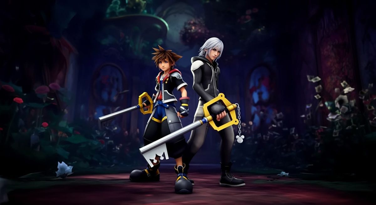 This image shows Sora and Riku from Kingdom Hearts exploring Wonderland. The scene has a 3D game cinematic feel with dynamic lighting and intricate details, reminiscent of a Disney-style video game.