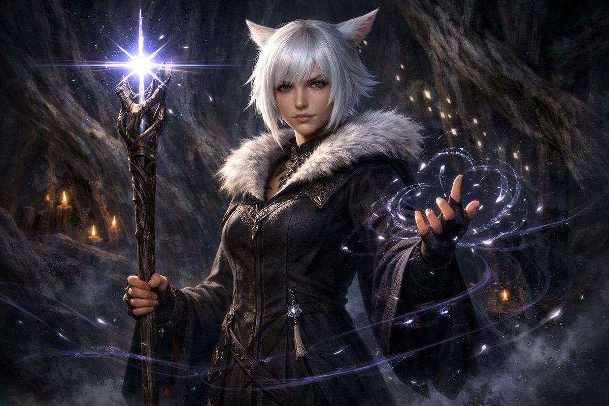 A high-fantasy portrait of Y'shtola Rhul, a Miqo'te spellcaster depicted as Night's Blessed, radiating calm vigilance and arcane authority in a detailed Sharlayan-inspired gown.