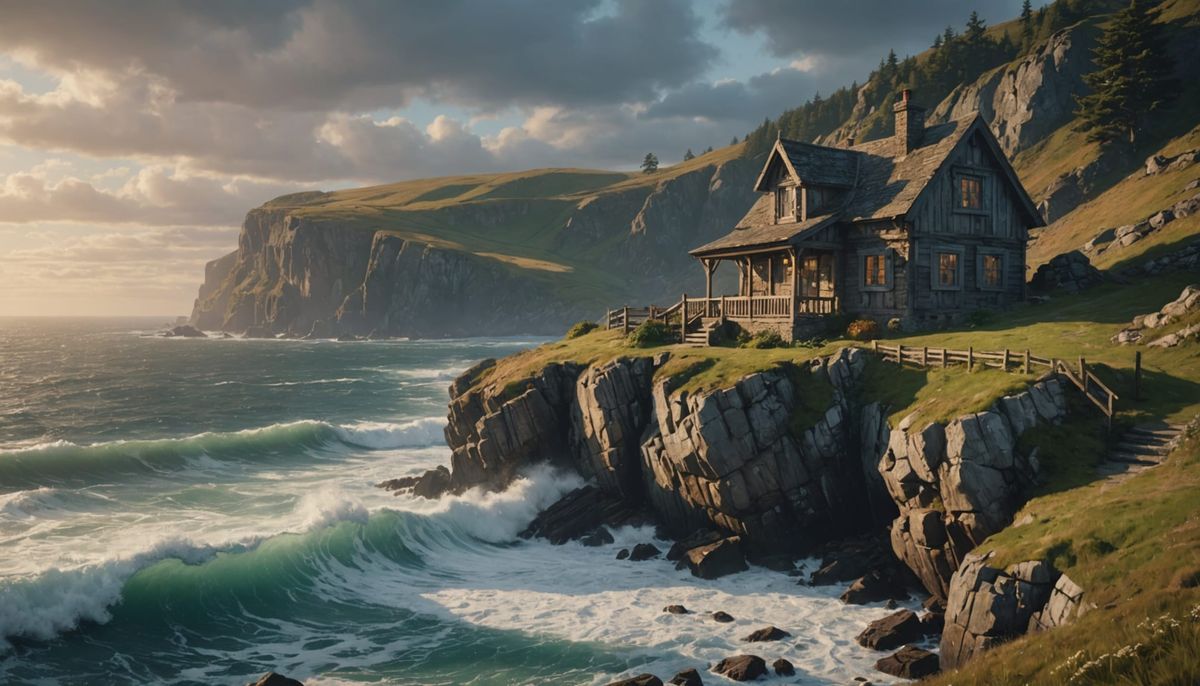 Easily generate your own oil paintings of cottages on rocky cliffs with our free AI art generator.